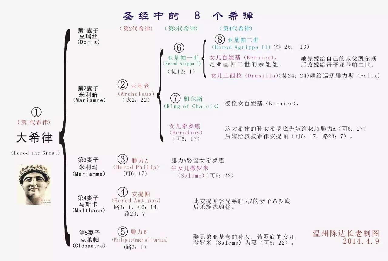 b,百妮基(Bernice,徒25:13),百妮基是亚基帕二世的亲姐姐。她先嫁给自己的叔父凯尔斯(Herod king of Chalcis),丈夫在主后54年去世后,她就跑到罗马和弟弟同住。为了隐匿这个罪行,为了堵塞闲言,她再次结婚,不得已嫁给基利家(保罗的家乡)王坡列模(Polemo)。坡列模原来不是受割礼的人。中介人说服他接受割礼,并说服他娶百尼基。结果坡列模贪着百尼基的财产而结婚了。不久之后等到亚基帕被封为王之后,她又抛弃了丈夫,改嫁给弟弟亚基帕二世。耶路撒冷被毁后,她先后作过维斯巴新(Vespasian,69 - 79)和提多(Titus,79 - 81)的情妇。