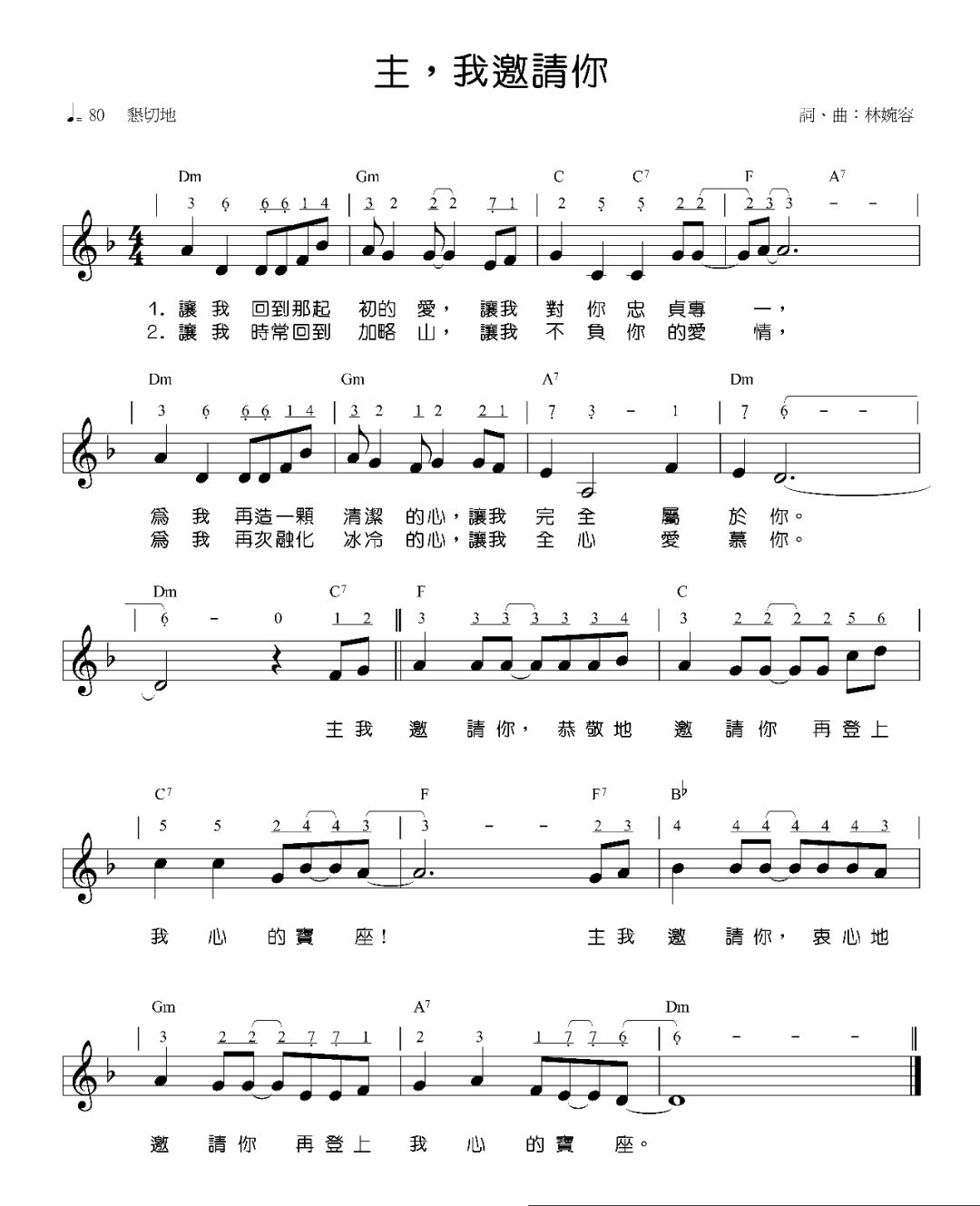 +- 首页 小羊诗歌 正文 音频播放地址: 视频播放地址: 词/曲:林婉容 演唱:小羊诗歌 专辑:《鼓舞》 让我回到那起初的爱 让我对祢忠贞专一 为我再造一颗清洁的心 让我完全属于祢 让我时常回到加略山 让我不负祢的爱情 为我再次融化冰冷的心 让我全心爱慕祢 (副歌) 主我邀请祢 恭敬地邀请祢 再登上我心的宝座 主我邀请祢 衷心地邀请祢 再登上我心的宝座 歌谱: 赞美诗歌未整理以斯拉盛晓玫祝瑞莲生命河灵粮堂小羊诗歌Jesus Image天韵合唱团新酒使命团我心旋律JLSS BlessedThe Hope佳音 收藏 分享 链接