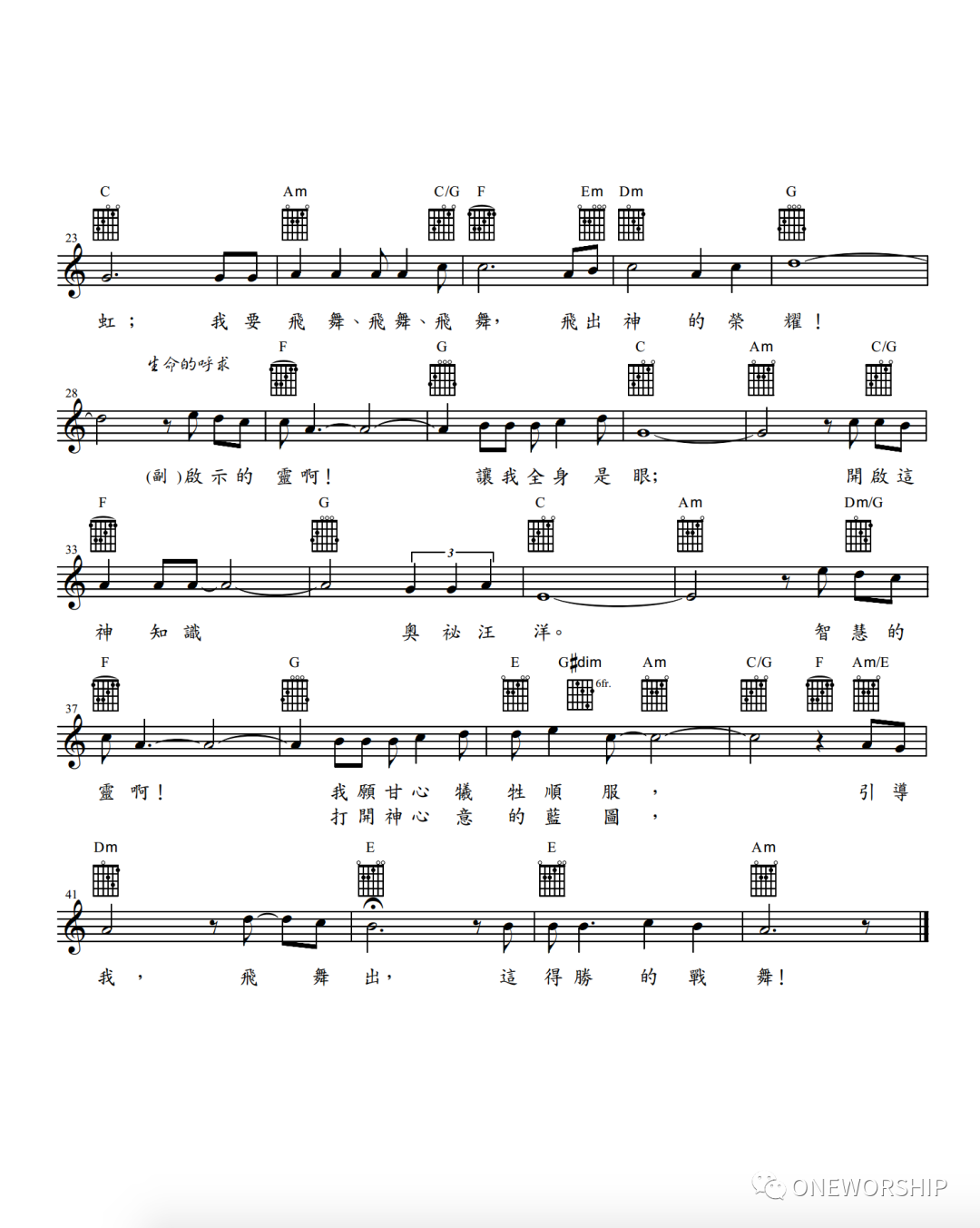 我展翅在这黑夜海洋 回想那日十字架前景象 惊异你这美丽非凡的心 如此尊贵如此圣洁 生命灿烂的光芒在黑暗大地绽放 我展翅在这黑夜海洋 回想那日十字架前景象 惊异你这美丽非凡的心 如此尊贵如此圣洁 生命灿烂的光芒在黑暗大地绽放 今圣灵引我向上飞翔 看见人子在高高宝座上 蓝色宝座的温暖光芒 辉映你的怜悯心肠 这玻璃海的火焰是你心中爱的烈焰 我展翅在这黑夜海洋 回想那日十字架前景象 惊异你这美丽非凡的心 如此尊贵如此圣洁 生命灿烂的光芒在黑暗大地绽放 今圣灵引我向上飞翔 看见人子在高高宝座上 蓝色宝座的温暖光芒 辉映你的怜悯心肠 这玻璃海的火焰是你心中爱的烈焰 明亮水晶飞溅在我心,释放圣洁的狂喜 我要吶喊吶喊,喊出心中的彩虹 我要飞舞飞舞飞舞,飞出神的荣耀 我要吶喊吶喊,喊出心中的彩虹 我要飞舞飞舞飞舞,飞出神的荣耀 启示的灵啊,让我全身是眼 开启这神知识奧秘汪洋 智慧的灵啊,我愿甘心牺牲順服 引导我飞舞出这得胜的战舞 我要吶喊吶喊,喊出心中的彩虹 我要飞舞飞舞飞舞,飞出神的荣耀 启示的灵啊,让我全身是眼 开启这神知识奧秘汪洋 智慧的灵啊,打开神心意的蓝图 引导我飞舞出这得胜的战舞 我要吶喊吶喊,喊出心中的彩虹 我要飞舞飞舞飞舞,飞出神的荣耀 启示的灵啊,让我全身是眼 开启这神知识奧秘汪洋 智慧的灵啊,我愿甘心牺牲順服 引导我飞舞出这得胜的战舞 引导我飞舞出这得胜的战舞 我要吶喊吶喊,喊出心中的彩虹 我要飞舞飞舞飞舞,飞出神的荣耀 启示的灵啊,让我全身是眼 开启这神知识奧秘汪洋 智慧的灵啊,打开神心意的蓝图 引导我飞舞出这得胜的战舞