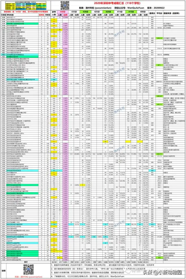 (1)共统计到深圳2020年中考118个学校成绩(新增:第二实验学校、翰林实验学校、龙岗区宝龙学校、龙岗区天誉实验学校、盐田区外国语学校、盐田区云海学校、盐田区实验学校),440分、430分、420分、410分、400分、最高分分别统计到112个、100个、87个、48个、89个、78个学校。
