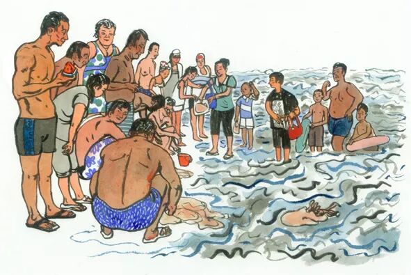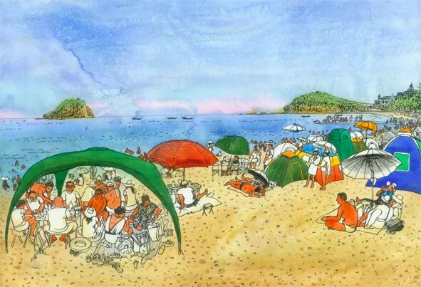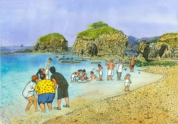 画面中描绘的就是夏家河子海边捡拾海蜇的场面。