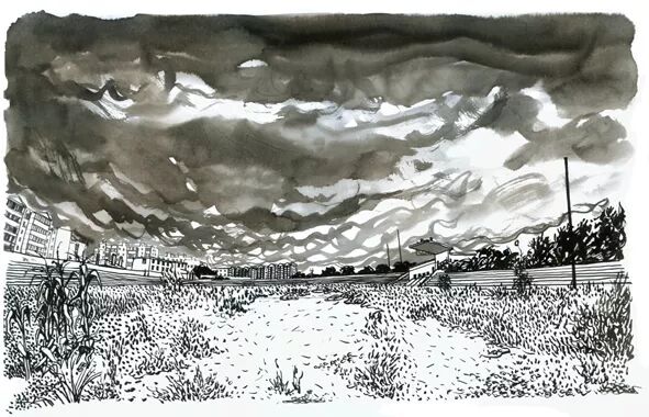 画作于2011年2月,用马克笔、毛笔和墨汁在表面光滑的印刷纸上画出的。