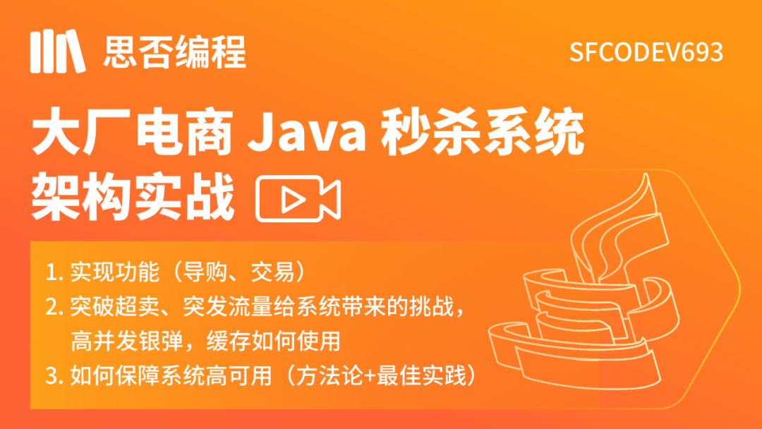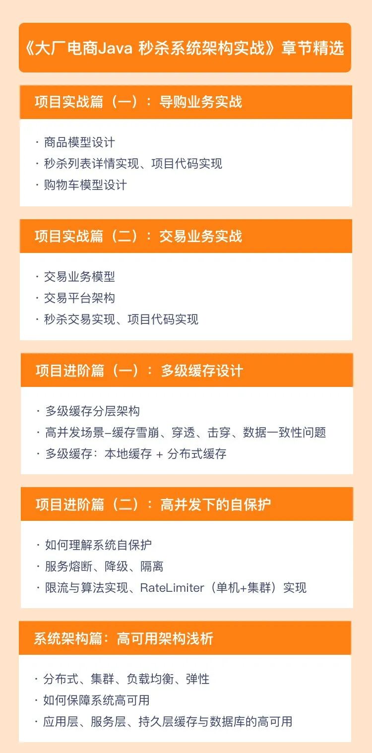《大厂电商Java秒杀系统架构实战》 ,从基础的设计到时间,系统的讲解大厂电商秒杀系统架构方方面面。看完面试涨薪应该没问题。