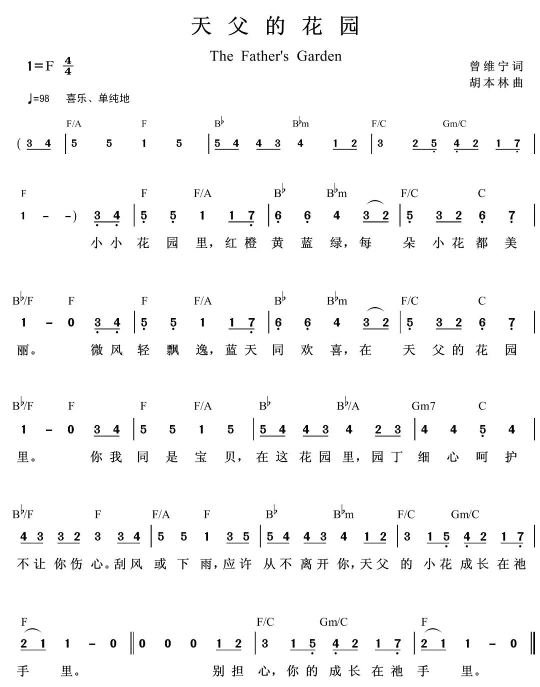 【天父的花园 Father's Garden】敬拜MVVerse 小小花园里 红橙黄蓝绿 每朵小花都美丽 微风轻飘逸 蓝天同欢喜 在天父的花园里 Chorus 你我同是宝贝 在这花园里 园丁细心呵护不让你伤心 刮风或下雨 应许从不离开你 天父的小花成长在他手里 Ending 别担心 你的成长在他手里