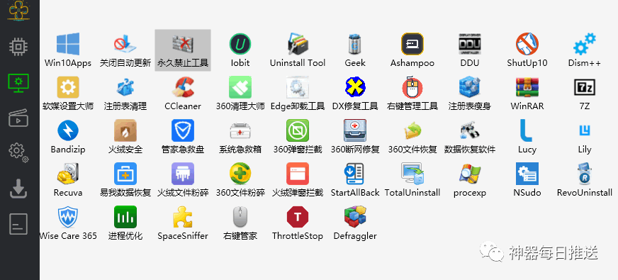 里面的关闭自动更新、顽固软件卸载、注册表清理工具、文件粉碎机、系统急救箱、断网急救箱等等都很实用。