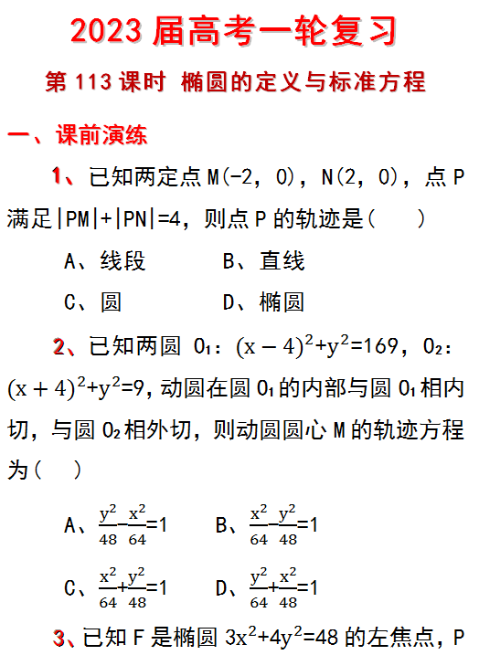 2023届高考数学第一轮复习--第113课时:椭圆的定义与标准方程