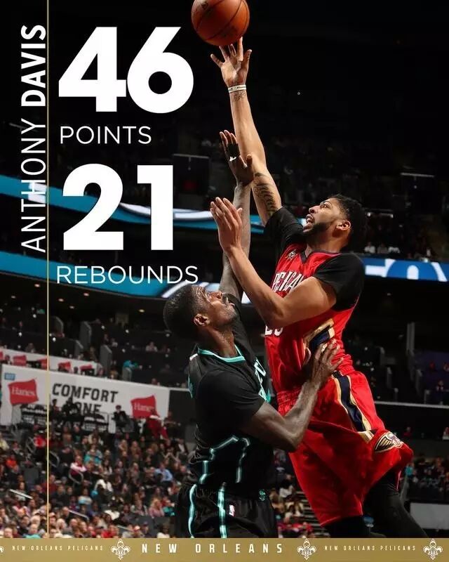 数据方面:安东尼·戴维斯46分21篮板3助攻,考辛斯11分4篮板4助攻;所罗·希尔16分3篮板2抢断,乔丹·克劳福德19分6助攻。黄蜂队肯巴·沃克24分8篮板12助攻,马文·威廉姆斯27分10篮板2助攻,巴图姆24分7助攻6篮板,贝里内利20分。