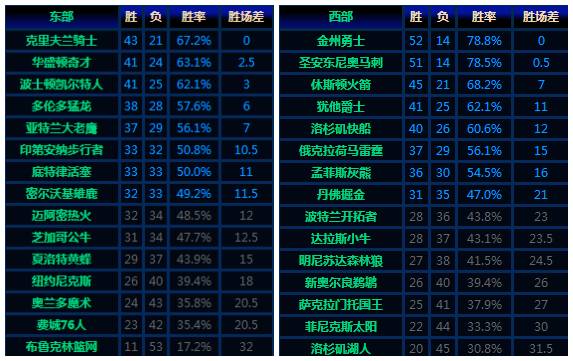 以下是东西部排名情况: